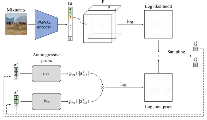 Autoregressive models have achieved impressive results over a wide range of domains in terms of generation quality and downstream task performance. In the continuous domain, a key factor behind this success is the usage of quantized latent spaces (e.g., obtained via VQ-VAE autoencoders), which allow for dimensionality reduction and faster inference times. However, using existing pre-trained models to perform new non-trivial tasks is difficult since it requires additional fine-tuning or extensive training to elicit prompting. This paper introduces LASS as a way to perform vector-quantized Latent Autoregressive Source Separation (i.e., de-mixing an input signal into its constituent sources) without requiring additional gradient-based optimization or modifications of existing models. Our separation method relies on the Bayesian formulation in which the autoregressive models are the priors, and a discrete (non-parametric) likelihood function is constructed by performing frequency counts over latent sums of addend tokens. We test our method on images and audio with several sampling strategies (e.g., ancestral, beam search) showing competitive results with existing approaches in terms of separation quality while offering at the same time significant speedups in terms of inference time and scalability to higher dimensional data.